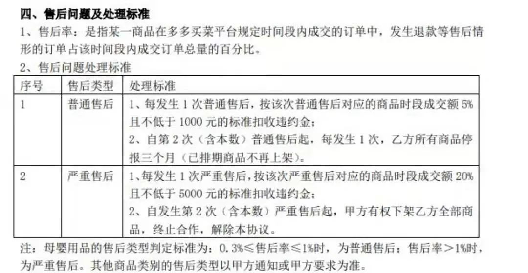 一位供应商表示,自己收到的某社区团购平台售后处理标准是这样的,发生一次普通售后(0.3%≤售后率≤1%)时,扣除成交额5%的违约金,自第二次普通售后起,每发生一次,该供应商所有商品停报三个月;售后率若大于1%,则供应商第一次要缴纳成交额25%的违约金,第二次则直接解约。