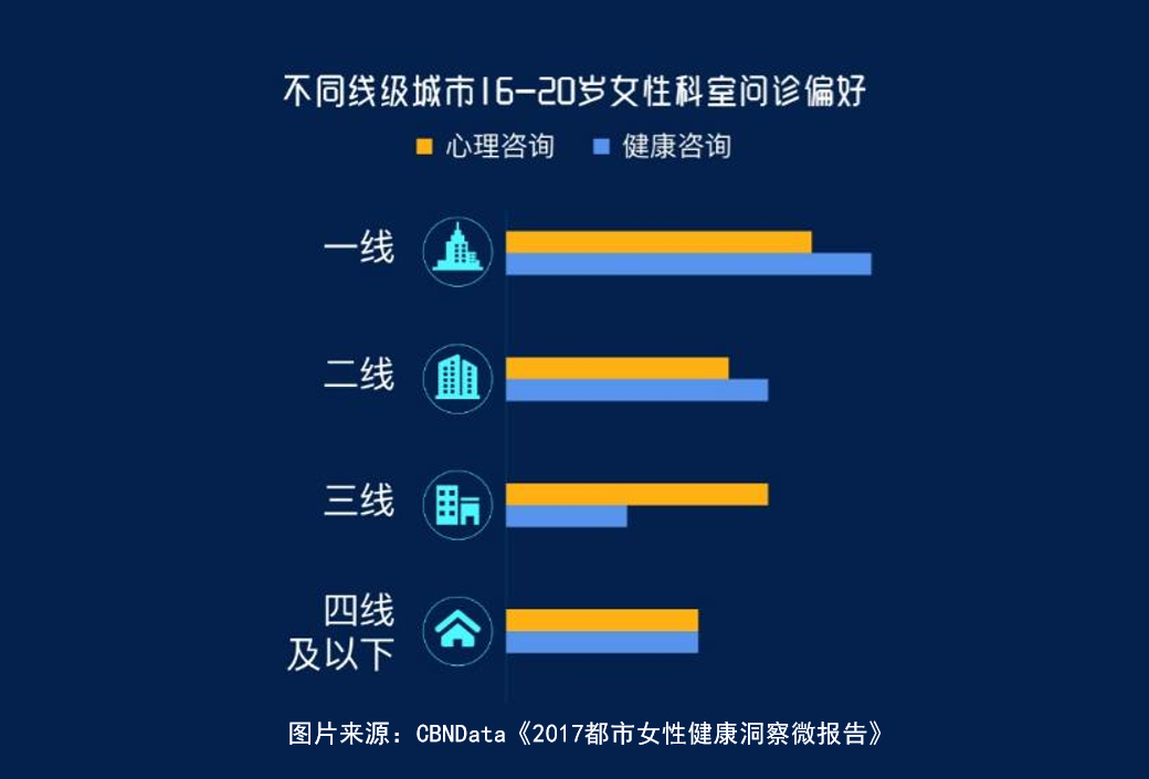 有趣的是,处于同一年龄段的她们,因为生活城市的不同,问诊偏好相差甚远,特别是在心理咨询、健康咨询和两性问题上。CBNData《报告》显示,在“健康咨询”方面,一、二线城市美少女的问诊量要远大于三、四线城市,在大城市生活的年轻女生关注自我的健康意识更强。“心理咨询”则有所不同,一线城市问诊量最大,三线城市则要大于二、四线城市。相比于过去,越来越多年轻女生开始把心理健康和身体健康放在了同样重要的位置。