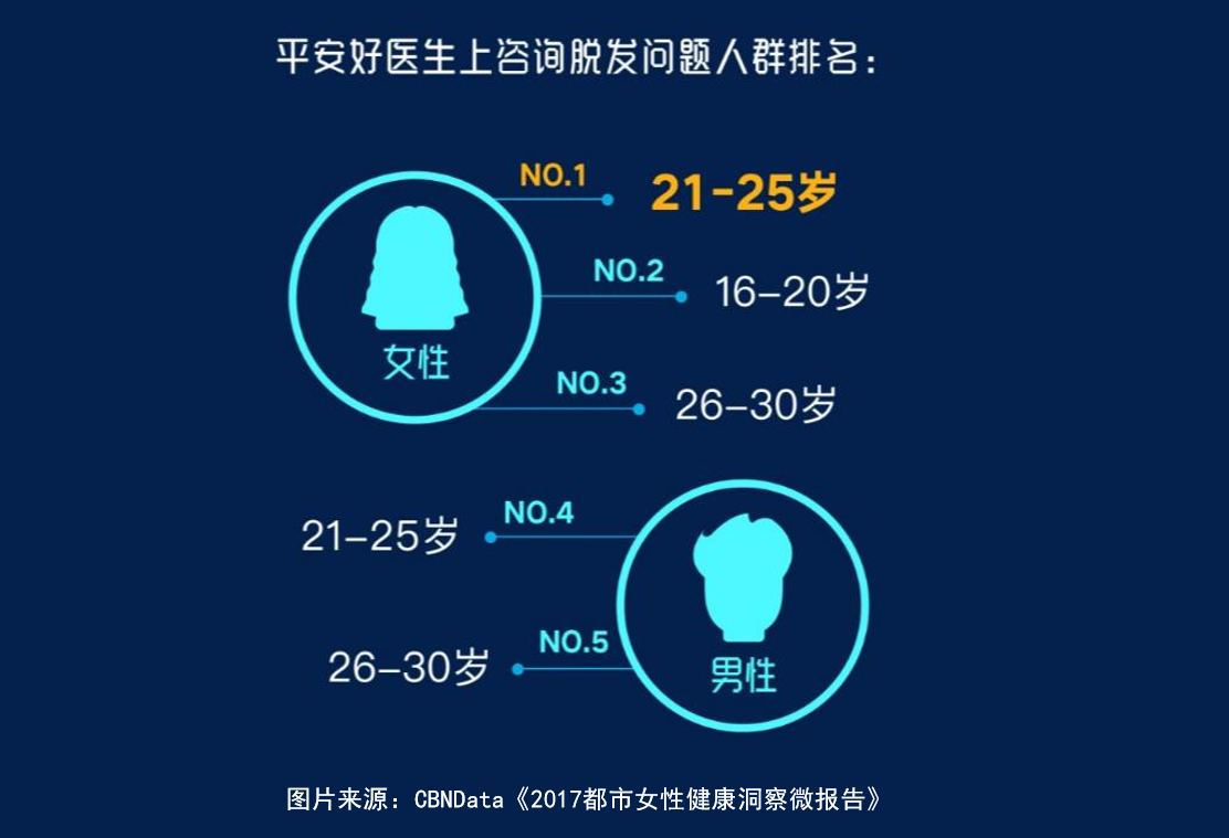 当青春美少女们长大几岁,初入职场,生活方式和节奏发生重大变化,神经外科成为了20-25岁女性中问诊量最大的领域,她们担心自己是否扛得住工作压力。此外,CBNData《报告》发现,在咨询脱发问题的人群里,这个年龄段的女生也排在第一,远高于同年龄段的男生。