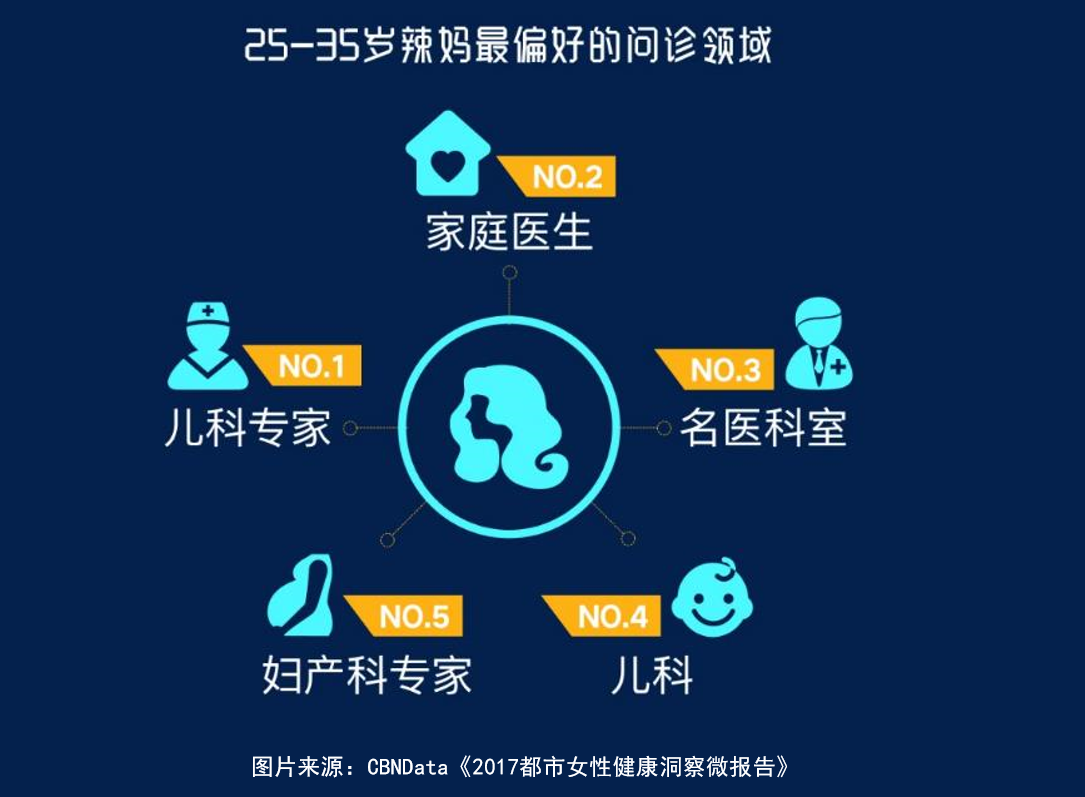 综合线上女性问诊数据,CBNData《报告》发现最热的三大科室分别是,妇产科、儿科、皮肤科。这其中表现最突出的是25-35岁的年轻妈妈们,61%的儿科问诊来自她们,而妇产科在这个年龄段的问诊量里只排在第五位,远远小于儿科专家和儿科,她们爱宝宝胜过爱自己。其中年轻妈妈们最关心的六大儿科问题分别是小儿发热、咳嗽、消化不良、上呼吸道感染、腹泻、感冒。雾霾天的时候,小儿呼吸道的咨询量最高峰增长达到44%。