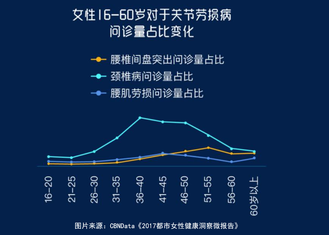 研究显示,人体会随着时间逐渐老化,最早是皮肤,从出生就开始,然后是大脑、肺脏。30岁一过身体老化加速,许多器官的功能以每年6.25%的速度衰退,年龄越大、衰退越快。CBNData《报告》发现,最困扰35-45岁女性人群的疾病主要是一些慢性病与器官性病变,这是随着年龄上升身体劳损的体现。比如,腰椎盘突出、颈椎病和腰肌劳损的问诊量以36-40岁为节点,前后趋势有明显区别。36-40岁之前,这三大问题的问诊量一直处于上升状态,集中爆发于40岁左右,特别是颈椎病,具有明显的年龄特征。传统医学上认为,“颈椎病可发生于任何年龄,以40岁以上的中老年人为多。”但随着生活方式的改变和积极预防保健的不足,近年来在青少年中也很常见。想要和时间赛跑,首先要问问你的颈椎是不是同意。