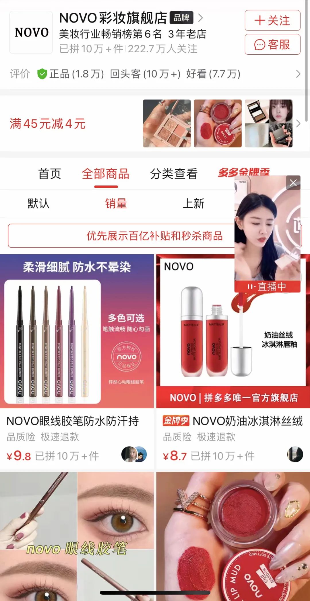 在天猫,novo旗舰店有SKU超50个,销量最高的单品月销在7000+,在新锐美妆国货中并不算突出。在抖音,novo上线单品152件,产品价格低于天猫旗舰店,销售前五的单品价格分别为10.9元、9.8元、5.9元、9.9元甚至1.9元;在拼多多,novo彩妆旗舰店内有9件单品销售超10万+,这9个单品的零售均价不超过10元。