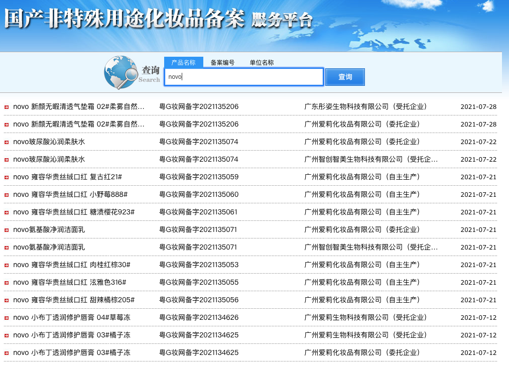 《化妆品财经在线》记者在国产非特殊用途化妆品备案平台看到,novo品牌备案近200件,除2017年和2021年备案的极少数产品为自主生产外,多采用代生产模式,委托广州彤姿生物科技有限公司、广州市伊亮日用品有限公司、广州爱莉生物科技有限公司、广州智创智美生物科技有限公司等多家代工厂生产。