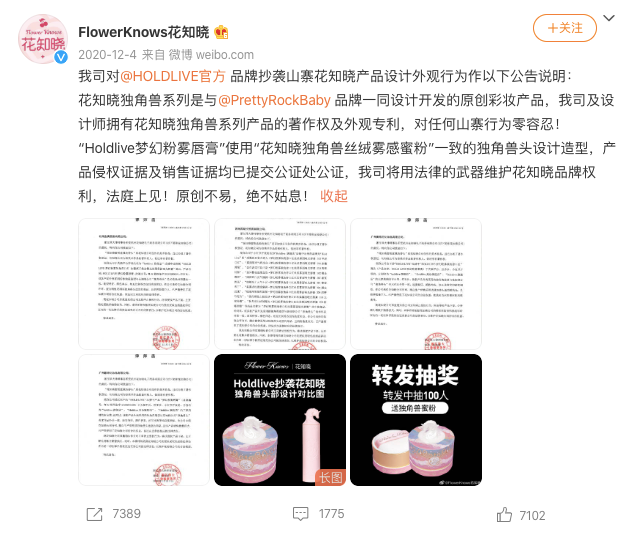 2020年12月,花知晓在微博控诉同为国产彩妆的品牌Holdlive抄袭其产品设计外观。但是在此之后,网友迅速发现Holdlive并未吸取教训,继续“复制”了完美日记的小细跟口红。