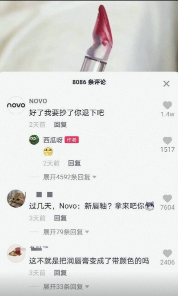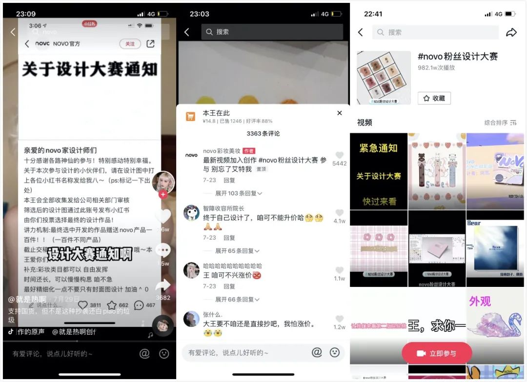 同时,品牌方似乎有意营造一种“穷”但是努力的形象。在抄袭事态扩大后,novo在抖音宣布开启“设计大赛”,向粉丝征集产品设计,奖品是100件novo产品。截至发稿日,这一话题播放量即将破千万。不少粉丝留言称“要不咱还是抄吧,我怕涨价”。