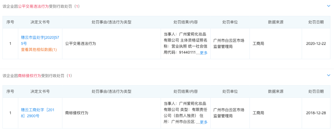 企查查数据显示,广州爱莉化妆品有限公司分别在2020年和2018年被行政处罚。前者是因为公司生产的一款口红,包装、装潢与娇兰ROUGE G/臻彩宝石口红近似,涉嫌公平交易违法,被罚款6万元;后者是公司未经商标注册人许可,擅自在其经营住所生产标有“LINE FRIENDS”商标的眼影盘,涉嫌商标侵权,被罚款5万元。