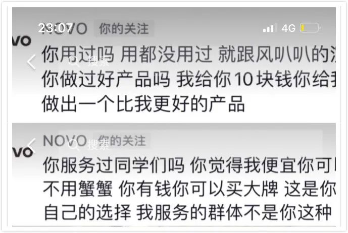 从网上流传的数张截图来看,novo官方抖音号在其他品牌/博主的抖音视频下留言:“好了我要抄了你退下吧”。而针对从7月开始蔓延的抵制风潮,novo品牌则认为这是网红们在蹭热度,并且发言声称“你(指参与抵制的博主们)服务过同学们吗”“我给你10块钱你给我做出一个比我更好的产品”。