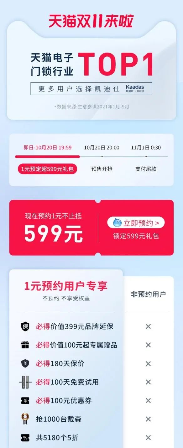 2021年双11预售期间,凯迪仕的表现依旧亮眼。截止10月25日,直播间预售种草成交金额处于智能门锁行业第一、家装大行业前五。