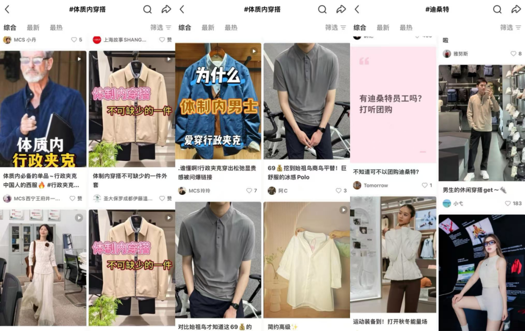在传播渠道上,小红书上的“体制内穿搭指南”常常推荐它的夹克与Polo衫,抖音上的测评视频也把迪桑特与始祖鸟、可隆放在一起对比,强调它在价格、设计和场合适配性上的优势。这种由用户推动的讨论,让迪桑特逐渐被贴上了“体制内穿搭”的标签。