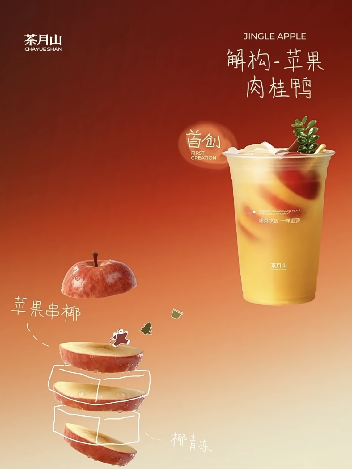 12月16日,茶月山将“解构苹果”的创意用到奶茶上,上线新品“解构-苹果肉桂鸭”,海棠果切块,签子定型成串,冰块则选择椰青冻巧妙替代,造型完美复刻“网红图”,拍照十分上镜。