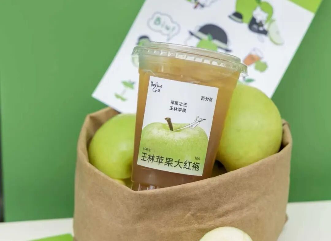 以“苹果之王,雄冠于林”强化品种优势、提升价值感。百分茶产品研发中心负责人杨世忠透露,产品上架即登门店销量榜首。