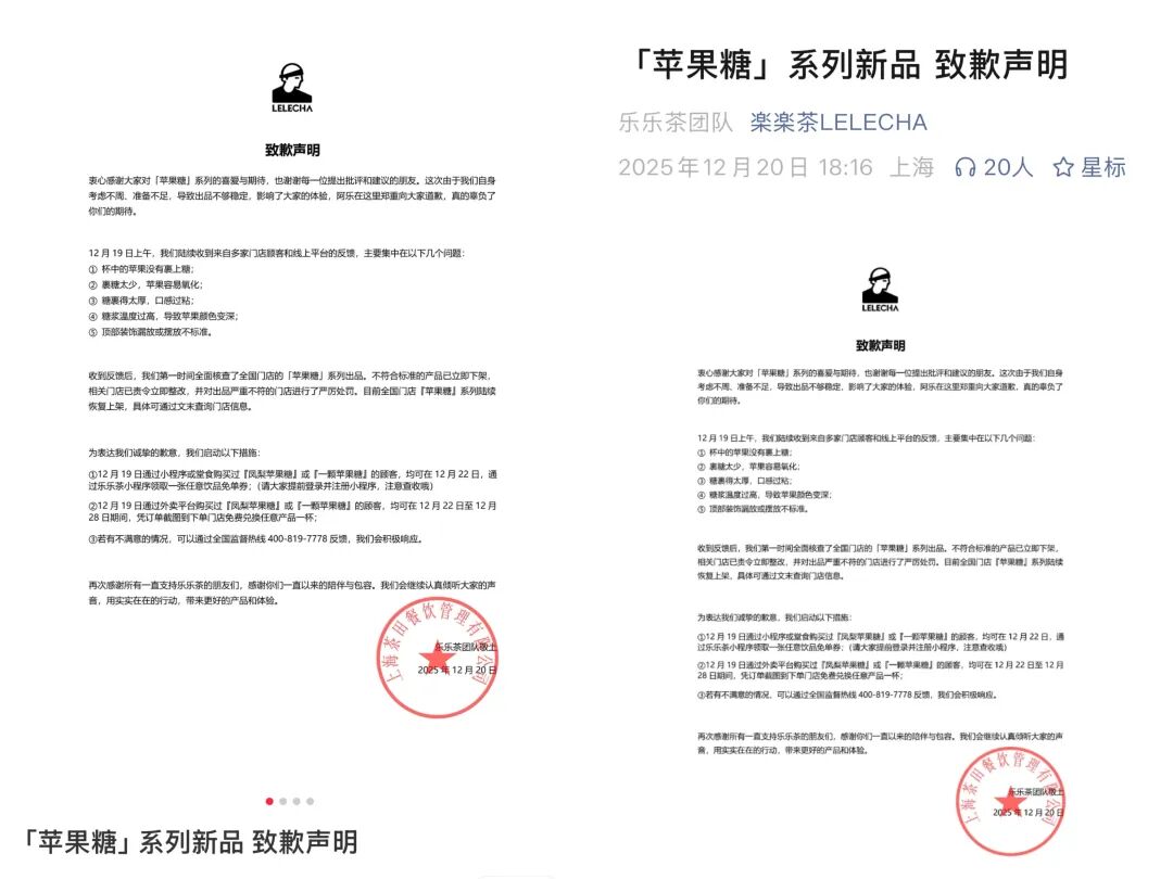 12月20日,乐乐茶发布致歉声明,表示已全面核査全国门店苹果糖系列的出品,不符合标准的立即下架,并责令相关门店整改、处罚出品严重不符的门店。