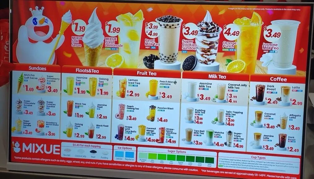 产品方面,蜜雪冰城并没有复制国内的菜单。在美国门店,产品甜度可以加到200%;冰淇淋的位置比奶茶更显眼;植物奶成为一种产品选项;价格依旧远低于当地餐饮店平均售价。