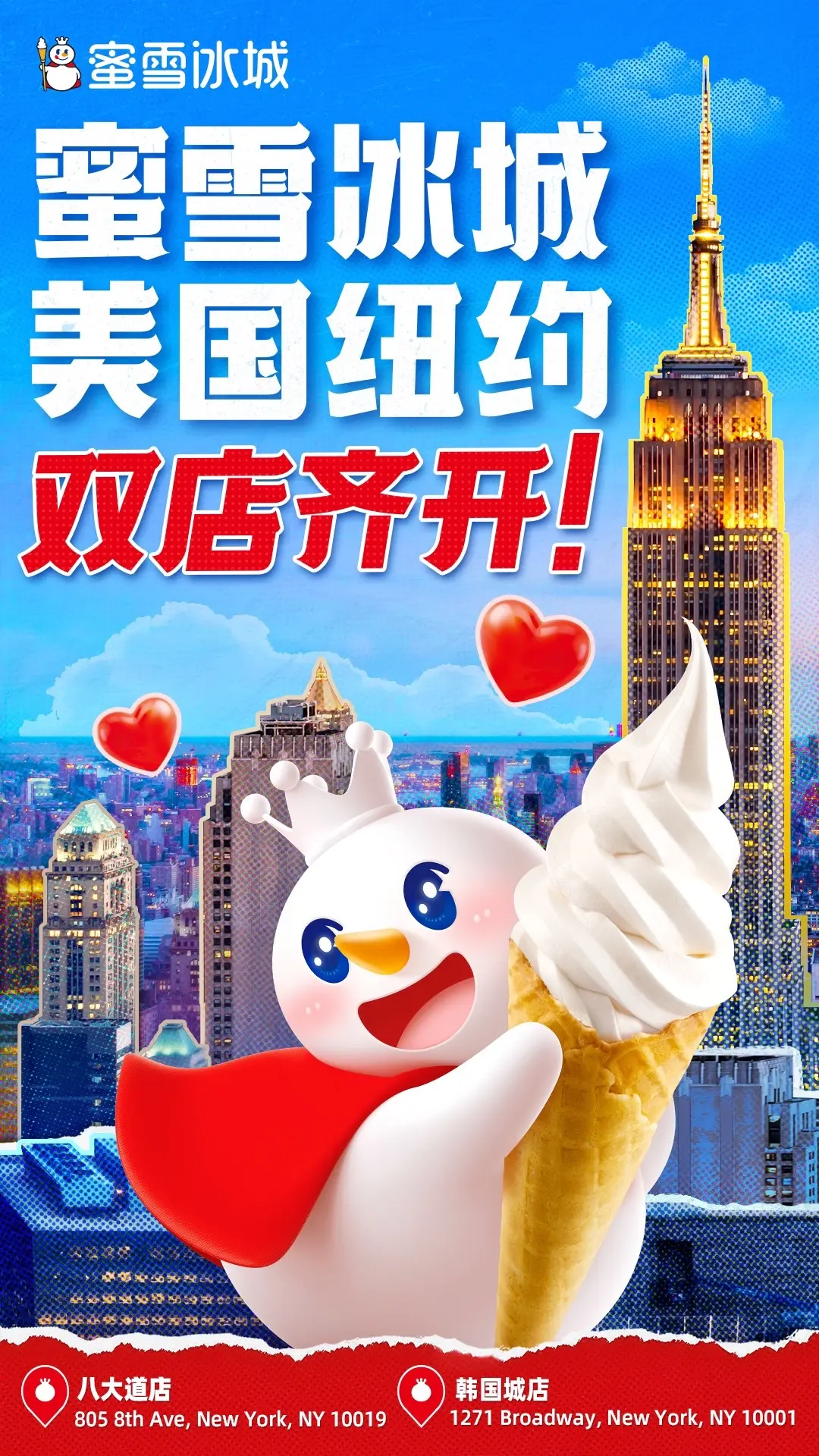 5天后,也就是12月25日,蜜雪冰城在纽约双店同开,两家店分别位于第八大道和百老汇大道。
