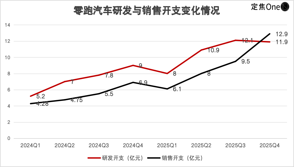 但有一点值得注意,在2025年Q4,零跑的销售费用(12.9亿元)首次超过了研发费用(11.9亿元),这说明随着销量的增长,零跑在广告宣传投放力度和销售团队的支出上也水涨船高。