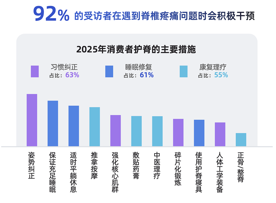 在睡眠管理进入“3.0阶段”的同时,越来越多人也意识到健康管理离不开系统性的主动干预,对于脊椎健康而言亦是如此。CBNData调研数据显示,92%的受访者在遇到脊椎疼痛问题时会积极寻求干预,而这些干预措施则紧紧围绕着“白天挤压损耗、夜晚关键修复”这一日常脊椎运转循环展开。其中,日间康复理疗、习惯纠正与夜间睡眠修复共同构成了当前主流的三大干预手段。