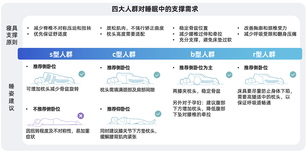 值得注意的是,由于不同人群的脊椎形态与睡眠困扰存在差异,睡眠支撑已经从“大众化”转向“分型定制”。虽然针对寝具的“支撑性”诉求是一致的,但s型、c型、b型、r型人群会呈现出不同的个性化需求——比如s型人群需要优先减少对脊椎的不对称压迫合扭转;c型人群则更需要放松肌肉,不强行矫正曲度;对于b型人群来说,首要是稳定盆骨位置,减少腰椎过伸和牵拉;而对于r型人群而言,需要优先改善胸廓和颈椎受力,并且减少呼吸受限和翻身压痛。