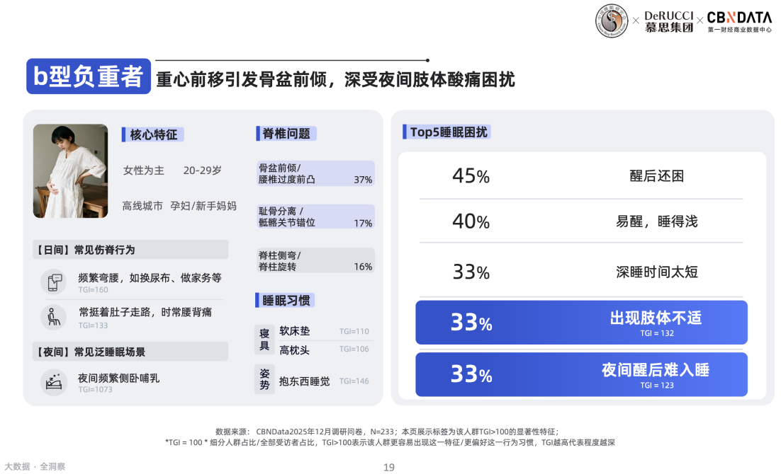 b型负重者特指孕妇和新手妈妈人群,她们或常挺着肚子走路,或频繁弯腰/侧卧哺乳,深受盆骨前倾、耻骨分离等脊椎问题困扰,而随之产生的肢体酸痛对这类人群的睡眠质量影响也更为显著。