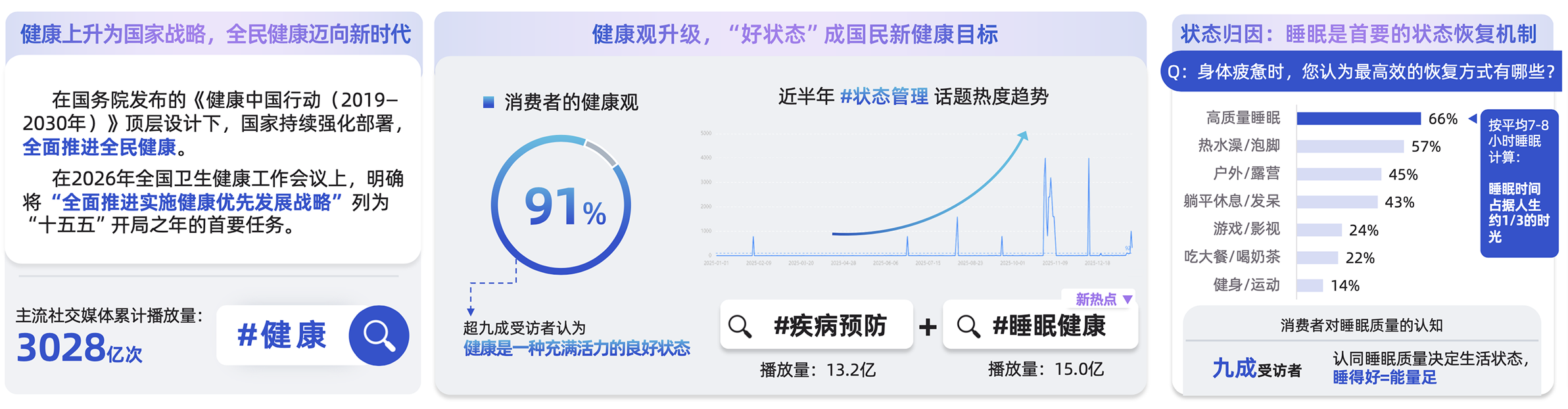 伴随着全民健康战略推进,健康受到了越来越多公众的关注,相关话题社媒声量破三千亿;公众对健康的理解也持续升级,91%受访者将健康定义为超越不生病的“好状态”,而高质量睡眠则被视为最高效的状态恢复方式。
