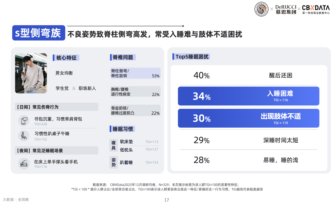 对于s型侧弯族而言,脊椎侧弯、脊椎旋转是核心症状表现,学生党、职场新人则是高发人群,这与年轻人喜欢花式侧躺、长时间一个姿势玩手机不无关系。落到睡眠痛点层面,醒后还困、入睡困难和肢体不适是困扰他们的前三大睡眠问题。