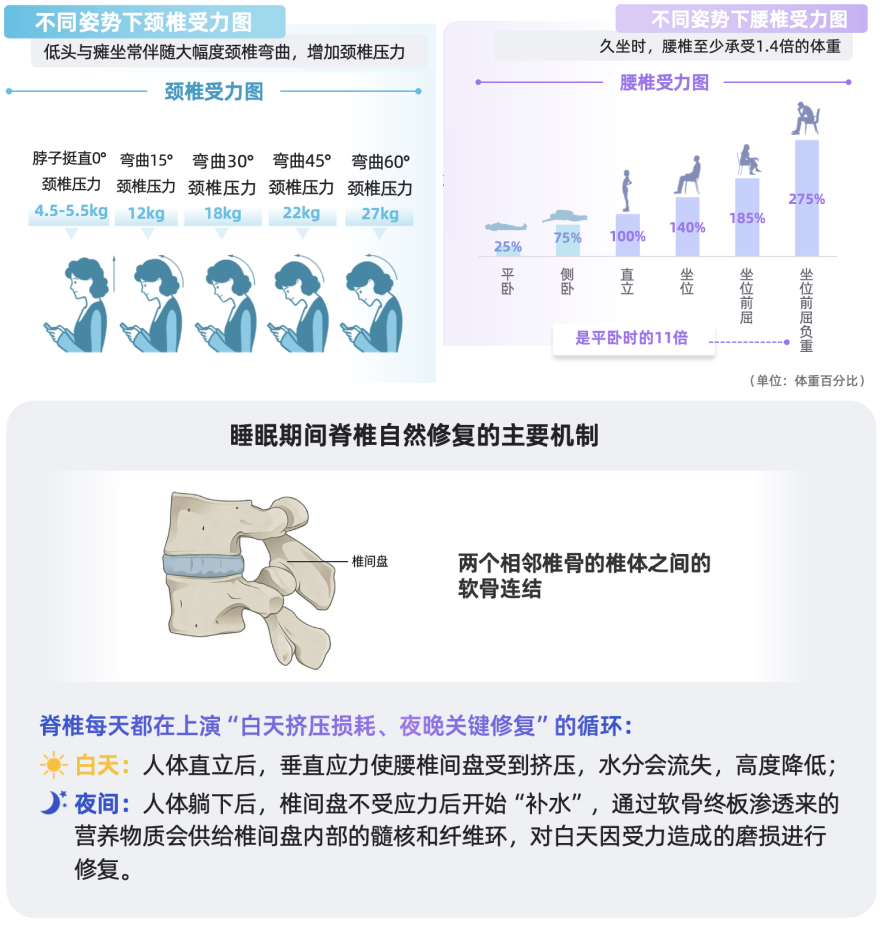与此同时,夜间休息也是阻断慢性劳损的关键窗口期。研究结果显示,平躺或侧卧是脊椎放松的重要时机,日间脊椎受力可高达夜间的11倍;而从睡眠期间脊椎自然修复的原理来看,夜间休息是椎间盘主要通过“再水化”来生理性修复日间损耗,脊椎每天都在上演“白天挤压损耗、夜晚关键修复”的日常循环。