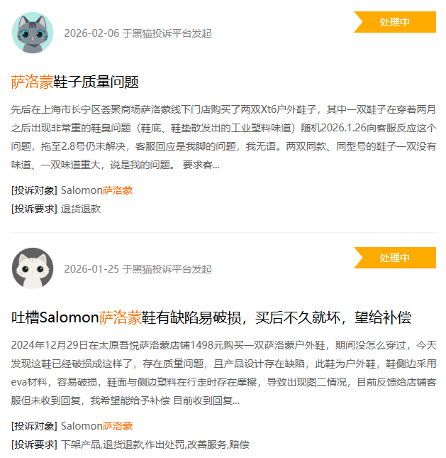 其次产品品控问题,已经开始成为困扰萨洛蒙的又一大隐患。虽然好看但却很容易坏、脚趾处开胶、脚后跟破洞等,在黑猫投诉平台上有关萨洛蒙的投诉量已经近1700条,大多数都集中在开胶、破损等品控问题上,难怪萨洛蒙被越来越多的消费者贴上了“花瓶”的标签。
