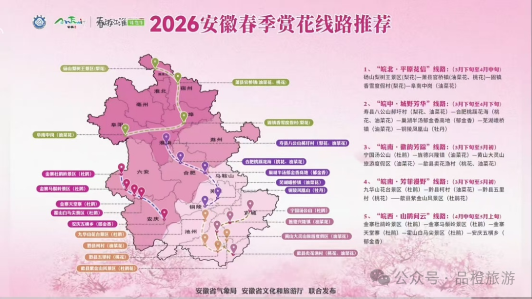 为了方便游客,安徽省推出“皖北·平原花信”“皖中·城野芳华”“皖南·徽韵芳踪”“皖西·山鹃问云”等主题线路,绘制2026安徽春季赏花线路地图。实现城市微度假与乡村深度游双向互补,既满足市民周末休闲需求,又带动乡村客流增长,以安徽为代表的全域赏花格局初步形成。