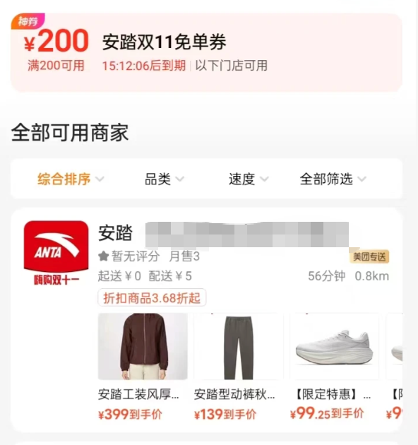 而据多家第三方电商监测机构分析,去年618期间安踏主品牌的核心单品折扣区间集中在 7–8 折;双十一期间,安踏主品牌在天猫推出了“折上六折”的优惠活动,同步入驻了美团闪购布局即时零售,并上线了“满200减200”的大额免单券,促销力度显著提升。