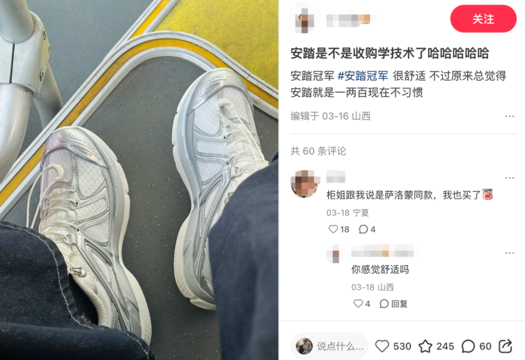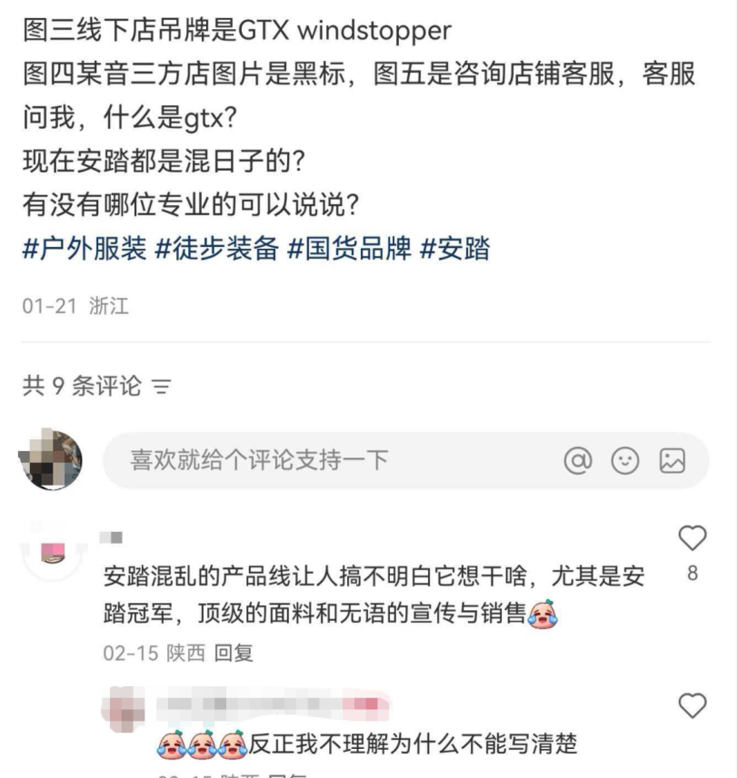 图片来源:小红书安踏混乱的产品线布局也引来不少消费者吐槽,主打高性价比的安踏冠军系列,在调性一致、产品辨识度上屡受争议。