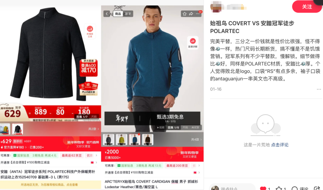 例如安踏冠军徒步PLOARTEC针织运动上衣,就被当做始祖鸟COVERT的完美平替,“同样是POLARTEC材质,安踏要比始祖鸟更厚,个人觉得败北是logo,antaguanjun一串英文不高级。”