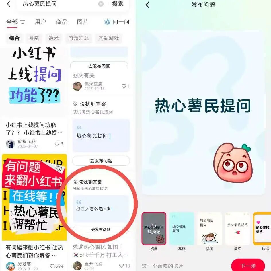 小红书的“去发布问题”功能同样位于搜索页面,在搜索结果页显眼位置能看到该入口,部分页面还会以“没找到答案,试试向热心薯民提问”的提示引导用户使用,贴合平台的社区化表达。