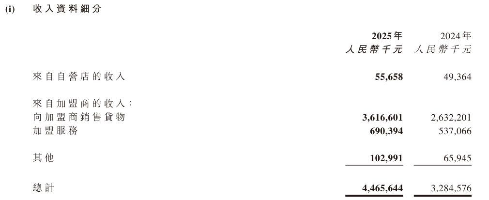 其他五家则依靠加盟,它们卖的不是奶茶,而是向加盟商出售原料、设备、包装材料和品牌服务。加盟商越多、门店开得越多,收入越高。开店本身就是赚钱的方式。