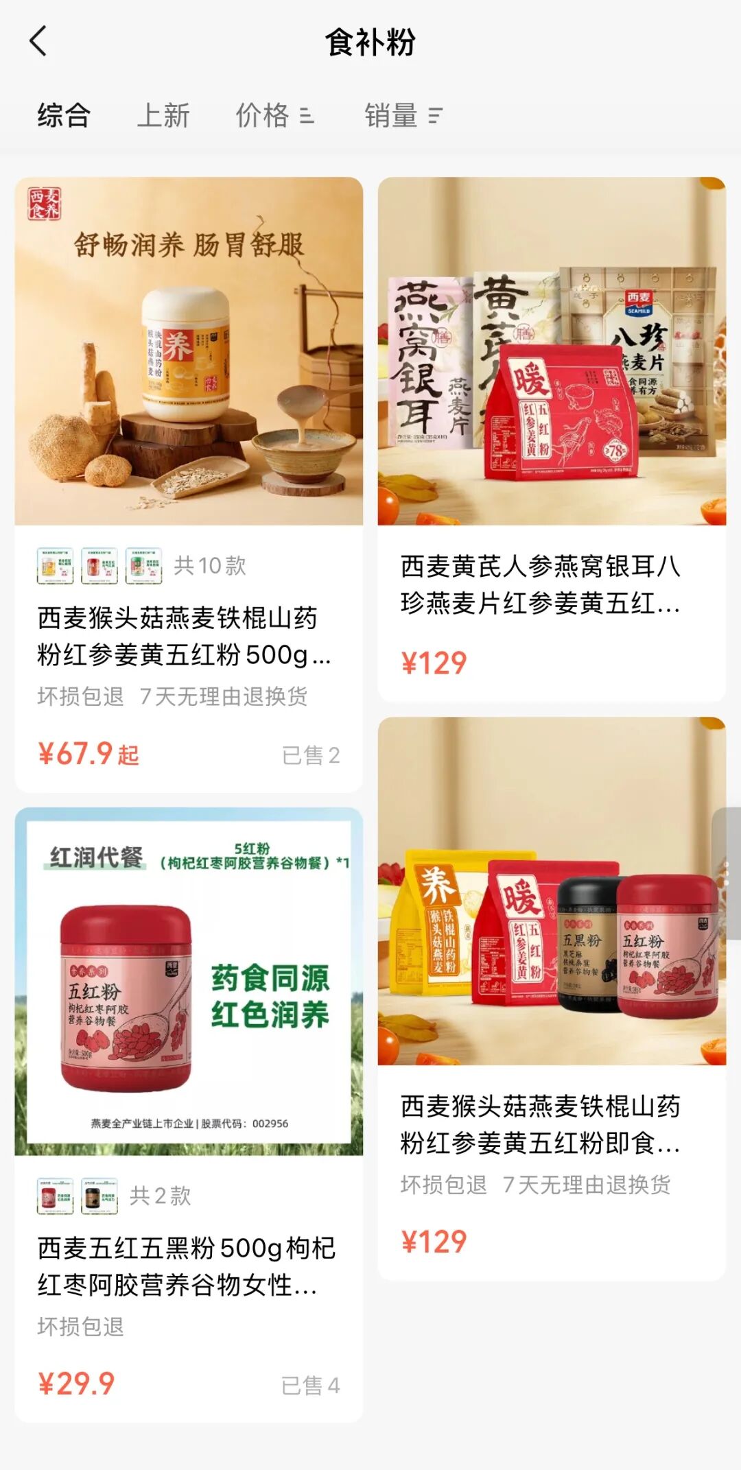 燕麦龙头西麦食品于2025年9月正式推出子品牌“西麦食养”。其官方微信商城显示,产品分为食补粉、饮料、谷物麦片、其他冲饮品四大类,代表性产品包括红参姜黄五红粉、黄芪人参燕麦片、猴头菇燕麦铁棍山药粉等。