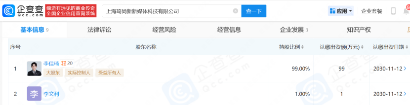 值得一提的是,2025年11月,李佳琦与母亲李文利还共同持股成立上海琦尚新新媒体科技有限公司,注册资本100万元,经营范围涵盖电视剧制作、电影摄制、互联网信息服务、广播电视节目制作等,业务边界彻底跳出传统直播带货范畴,布局影视与内容制作领域。