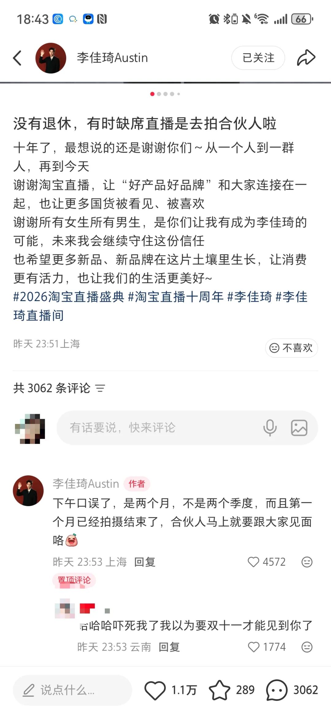 不过,李佳琦很快便对自己的说法进行了更正。昨日深夜及今日凌晨(4月9日0时6分),李佳琦先后在小红书和微博发文回应,称自己没有退休,且缺席直播是为了拍摄综艺。同时,他还在评论区补充解释道,“下午口误了,是(缺席)两个月不是两个季度,而且第一个月已经拍摄结束了,合伙人马上就要跟大家见面咯!”