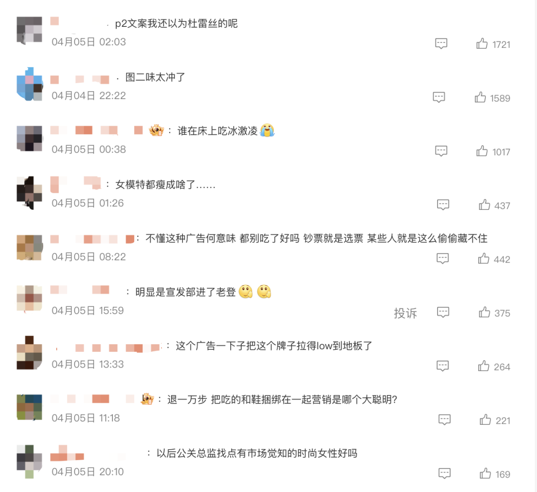 “这广告一下子把这个牌子拉得low到地板了”、“明显是宣发部进了老登”、“这是把冰淇淋广告拍成了成人用品广告”......网友们纷纷留言。也有部分网友认为有些过度解读,“芭蕾舞鞋是很有创意的海报设计”。
