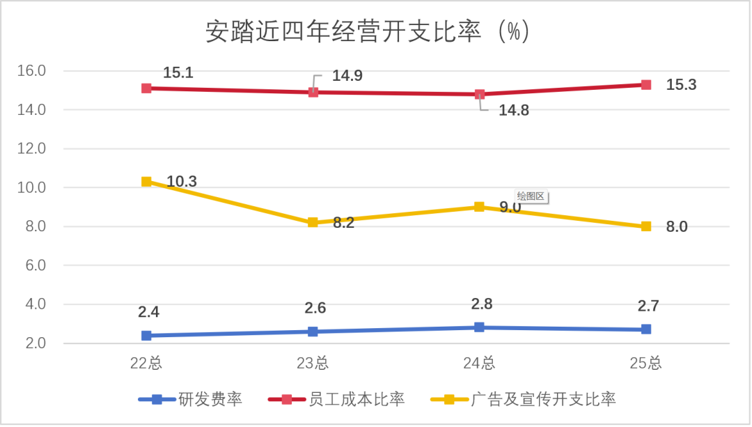 DTC转型、AI时代研发加码叠加海外市场并购脚步不停,安踏花钱的地方很多,短期来看成本侧的开支不会明显收缩。