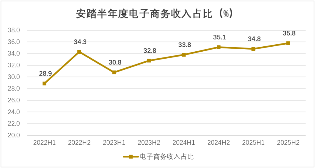 而相较而言,安踏主品牌2025年门店数缩减至9855家,平均月店效为29.4万元,单店年营收仅有约353万元,当然离不开线上渠道。