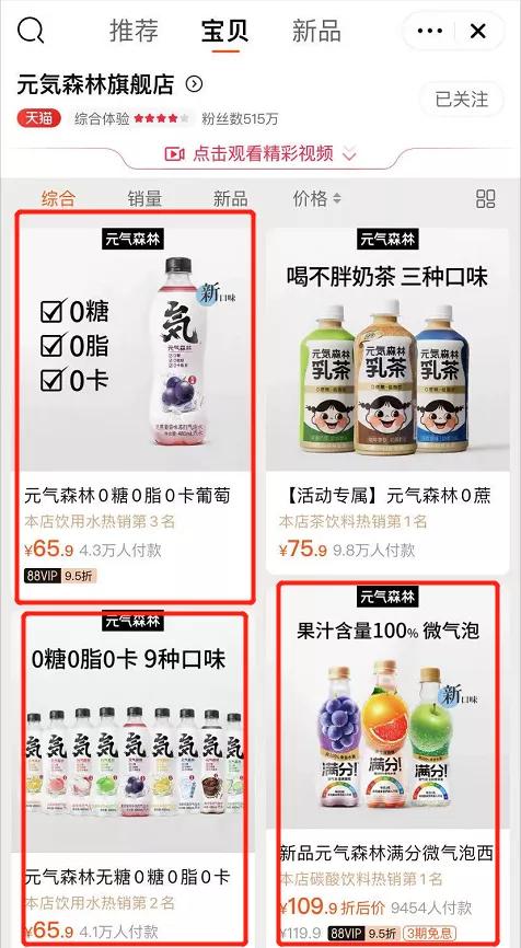 可以说,元气森林找到一条最适合自己的产品路径,并且成功俘获了大批消费者的芳心。在元气森林的天猫旗舰店,按综合指数来看,排名靠前的除了牛乳茶,几乎全是气泡水了。