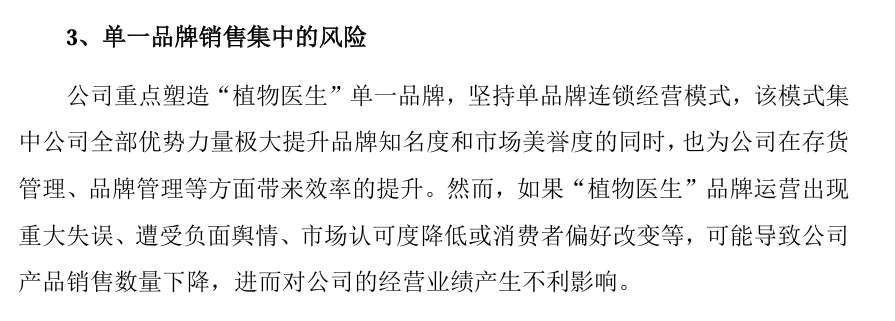 此外,植物医生也在其招股书中提到,其运行的单品牌连锁经营模式,虽然能集中公司力量,来提升品牌知名度和市场美誉度,但是一旦品牌运营出现重大失误,可能导致公司产品销售数量下降,进而对公司的经营业绩产生不利影响。