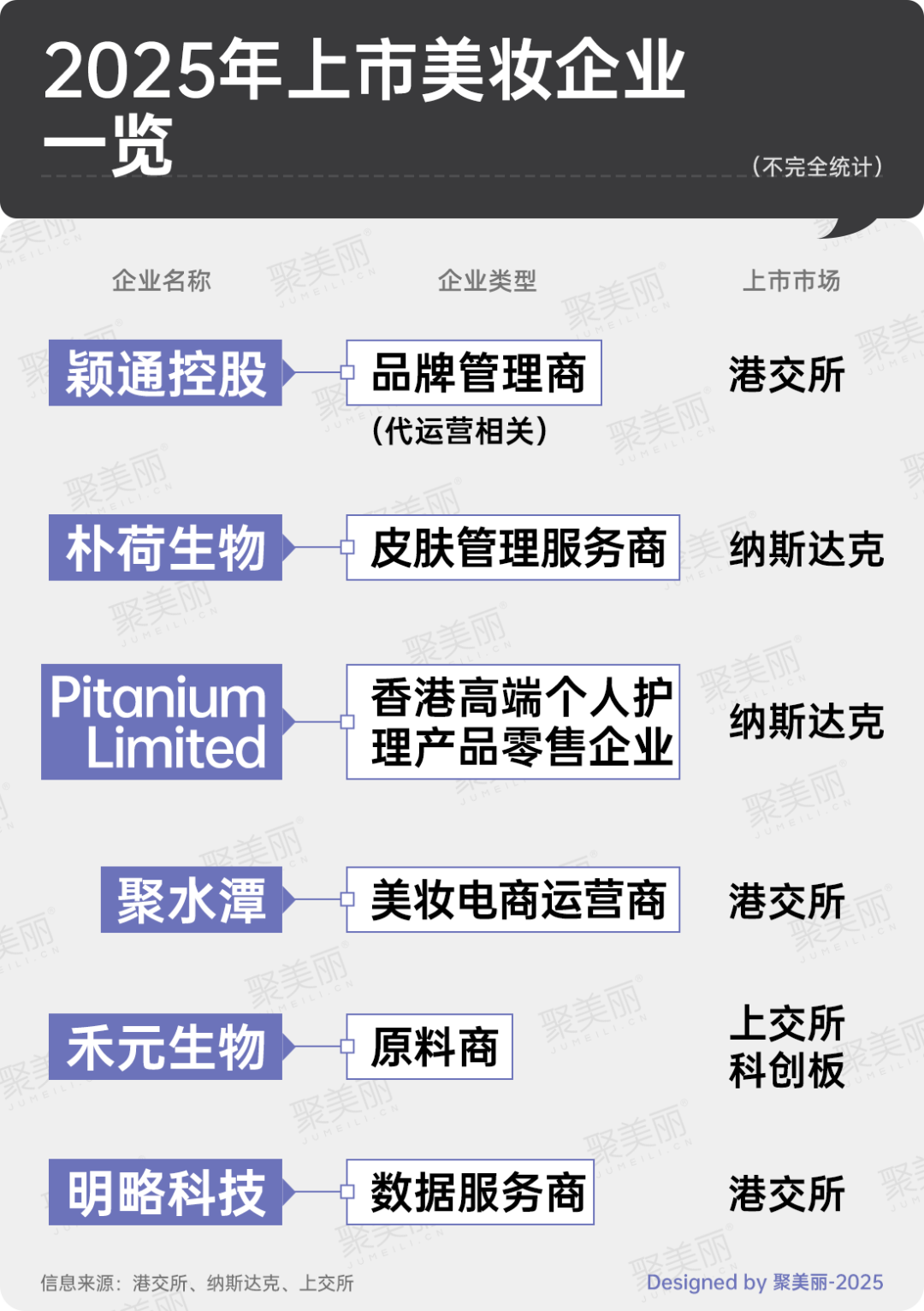 从今年上市的企业来看,其都具备聚焦细分赛道的优势、清晰的定位与成熟的商业运营模式。它们分别是手握爱马仕、宝格丽等合作的品牌管理公司颖通控股、专业化皮肤管理服务商朴荷生物、香港高端个人护理产品零售公司Pitanium Limited、美妆电商运营商聚水潭、重组胶原蛋白企业禾元生物以及数据服务商明略科技。