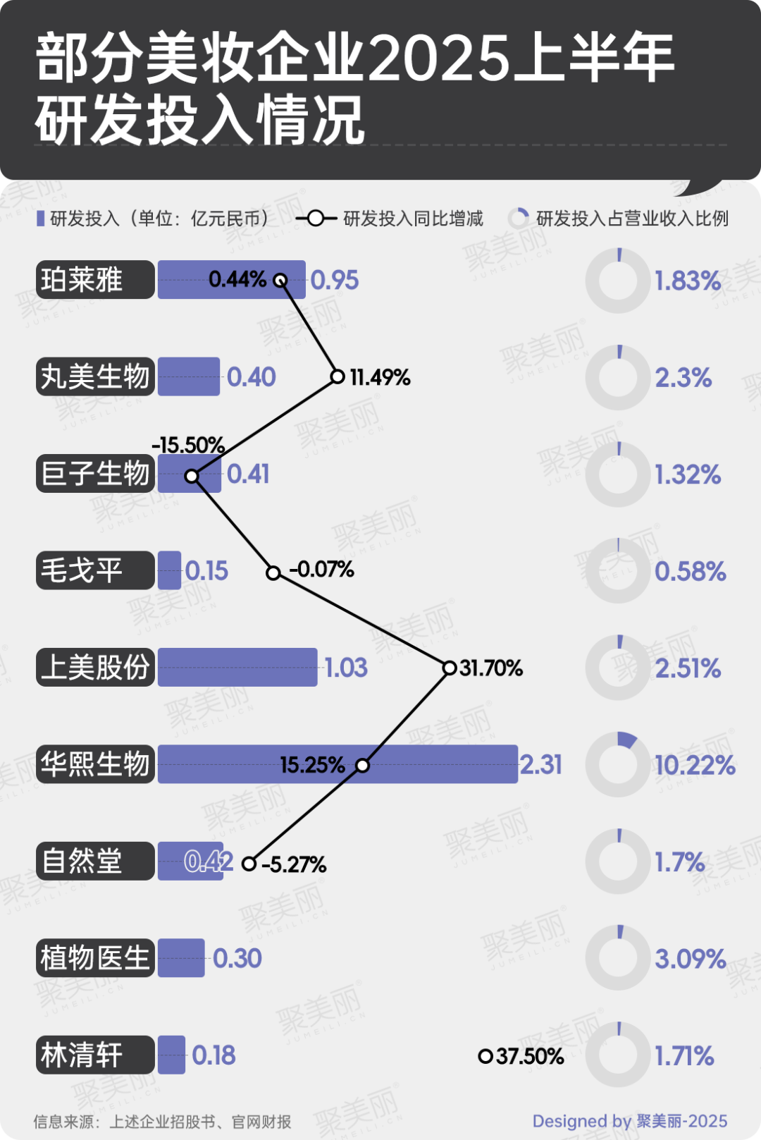 如下图所示,华熙生物以原料起家,研发投入一直处于行业前列,2025上半年达到2.31亿元,而以重组胶原蛋白技术闻名的巨子生物,研发投入则大幅减少15.5%至0.41亿元。林清轩虽然目前的研发投入相对较低,但今年上半年增长达37%以上,可见其正在补研发这一短板。