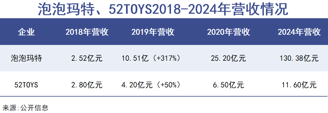 2018年时52TOYS营收曾经压泡泡玛特一头。到2019年,52TOYS实现了50%的营收增速,但同年泡泡玛特却迎来了317%的大爆发。究其根本,在于二者对IP孵化的态度有别。