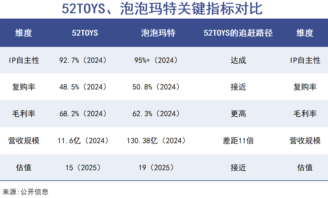 如果说卡游与泡泡玛特是形似神不似,那52TOYS可以说是形神兼具的同类。自主IP、高毛利、强复购一样不少。中金的研究报告中曾经写道,“52TOYS是唯一具备独立上市能力的国产潮玩IP公司,若2026年重启IPO,估值有望达25亿元”。