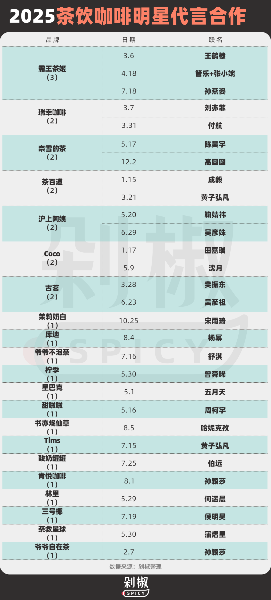今年,剁椒Spicy的统计范围扩大到47个茶饮咖啡品牌。它们在今年1月至12月进行了240次联名,与去年相比规模略有缩减,但29次的明星代言和合作补上了这一空缺。繁盛仍在,玩家更多,节奏却更理性。