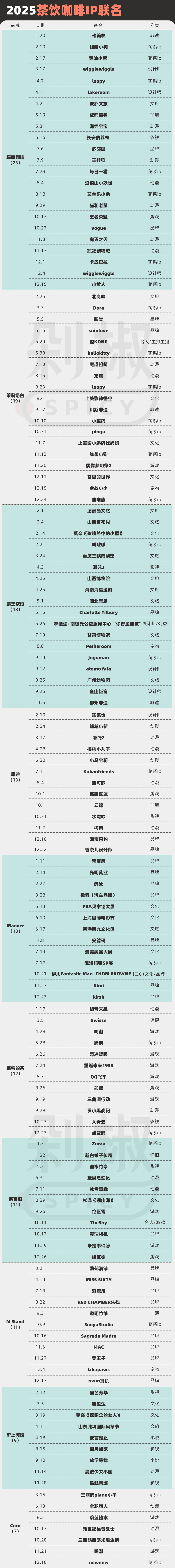 值得注意的是,除了瑞幸,去年的冠亚军奈雪和乐乐茶都收缩了联名动作。奈雪的茶在2024年拿下23个联名,位居榜首,而今年12次的联动数量仍在前列,但周期明显延长,释放出明确的转身信号。乐乐茶在去年以17次联名位居次席,今年却骤跌至4次。