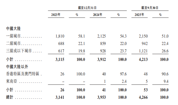 另外,从袁记云饺近些年开店情况可以看出,下沉趋势明显。招股书披露,截至2025年前三季度,其在中国大陆三线及以下城市门店数量达1121家,占比26.6%,较2023全年的617家、占比19.8%大幅提升,成为增速最快的市场层级;同期,一线城市门店占比则从58.1%持续收缩至51.0%。