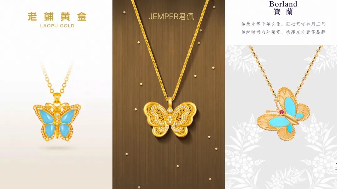 比如同样主打高端古法金的“宝兰”:如出一辙的匠心古法,大同小异的中华文化,门店只开在万象城、杭州大厦这类高端商场。至于产品设计,估计老铺的人自己看了,也会觉得既熟悉又陌生。