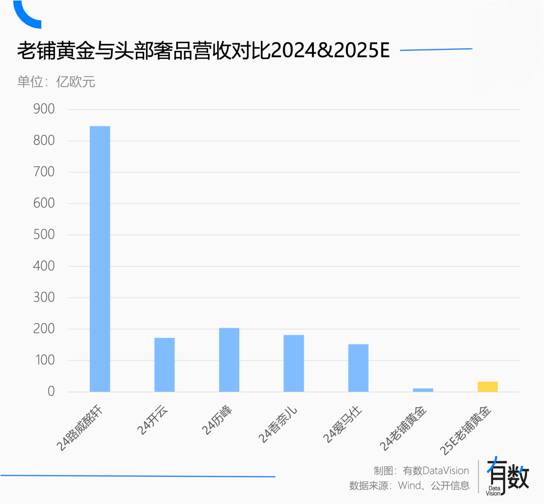 2024年(自然年),三大奢侈品集团和两大奢侈品品牌合计营收超过1500亿欧元,约等于全球的奢侈品大盘。相比之下,老铺黄金2025年全年营收估计“只有”300亿港币左右。