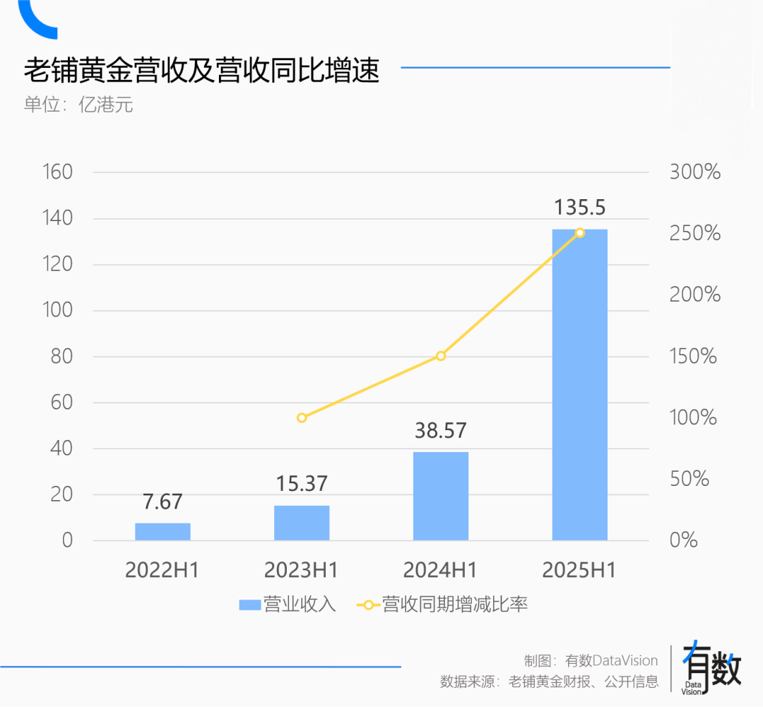 从营收上看,奢侈品巨头已经在下行通道里走了快两年。强如LVMH,也不过勉强摸到止跌的台阶。反倒老铺黄金的营收增长让人头晕目眩,25年上半年,老铺营收135.5亿港元,同比增长251.24%[2]。